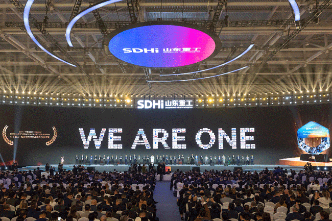 大會正式發(fā)布山東重工全球品牌標識,任剛、滿慎剛、王志堅和戰(zhàn)略合作伙伴代表、海外員工代表共同為品牌標識揭幕。